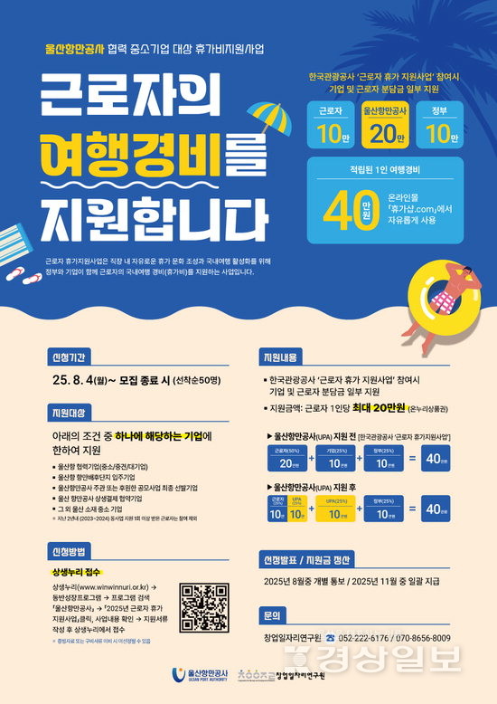 이번 사업은 한국관광공사의 근로자 휴가 지원사업과는 별도로 진행된다. UPA는 기업과 근로자 분담금에 각각 10만원씩을 추가로 지원해 중소기업 근로자들의 휴가비 부담을 완화하는 것이 골자다.