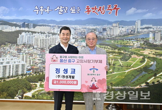 ▲ 정성교 (주)정성개발 대표는 7일 울산 중구청 구청장실을 찾아 고향사랑기부금 100만원을 전달했다. 정 대표는 지난 2023년부터 올해까지 총 400만원의 고향사랑기부금을 기탁했다.정성교 (주)정성개발 대표는 7일 울산 중구청 구청장실을 찾아 고향사랑기부금 100만원을 전달했다. 정 대표는 지난 2023년부터 올해까지 총 400만원의 고향사랑기부금을 기탁했다. 저작권자 © 울산일보 무단전재 및 재배포 금지 주하연 기자 다른기사 보기 페이스북 트위터 카카오스토리 URL복사 기사공유하기