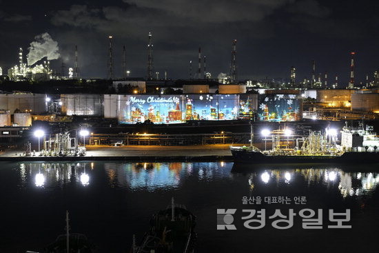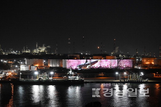 ‘장생포 라이트’는 높이 19m, 전체 면적 2850㎡로 축구장 3분의 1에 달하는 SK 제품저장탱크 4기를 스크린으로 활용해 산업수도의 상징인 장생포만의 특별한 야간경관을 선보인다.