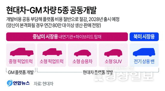 우선 양사는 내연기관·하이브리드 시스템을 모두 탑재할 수 있는 중남미 시장용 중형 픽업·소형 픽업·소형 승용·소형 SUV 4종과 북미 시장용 전기 상용 밴 등 총 5종의 차세대 차량을 공동 개발한다.