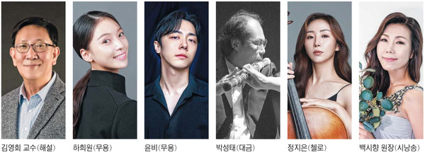 이번 무대에는 동국대학교 세계불교학연구소 ‘향가 만엽집’ 연구교수인 김영회 교수의 학술적 해설을 비롯해, 한예종 출신의 무용수 하희원, 부산대 무용과 출신이자 처용무 전승자인 윤비, 울산시립무용단 국악관현악단 대금 연주자 박성태, 첼리스트 정지은과 소리는 별별소리연구소 대표 김예진이 출연한다. 또한 한국문학예술원 백시향 원장과 회원 차대희, 임명희씨가 낭송자로 참여해 문학과 무용, 음악이 긴밀히 어우러진 무대를 완성한다.