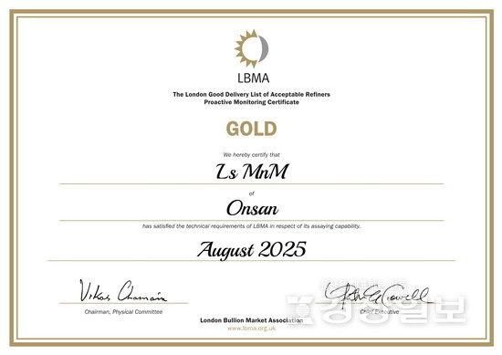 LS MnM은 순도 99.99% 이상의 귀금속을 생산하는 포나인(Four-nines) 제련소로, 다른 기업 대비 더욱 까다로운 평가를 받았다. 이번 심사에서는 모든 시료의 분석치 차이가 0.005% 이내로 특정되며 완전 통과(Full Pass) 판정을 받아 최우수 등급으로 합격했다. 이에 LS MnM은 금 13년, 은 10년 연속 LBMA GDL 자격을 유지하게 됐다. 이미 확보한 책임 있는 금·은 인증(Responsible Gold and Silver Certificate)과 함께 품질·ESG 양측에서 글로벌 시장 경쟁력을 강화했다는 평가다.