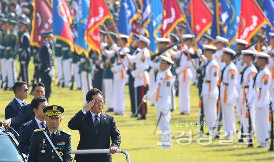 이 대통령은 이날 계룡대에서 열린 건군 77주년 국군의 날 행사 기념사에서 “급변하는 안보 환경에 능동적으로 대응하려면 자주국방은 필연”이라며 이같이 밝혔다.