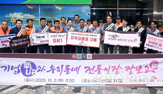 김두겸 울산시장과 유호섭 SK케미칼 생산본부장, 김충곤 한국노총 울산지역본부 의장, 임현철 울산시 대변인 등이 지난 2일 추석을 맞아 울산 남구 신정상가시장에서 기업과 우리동네 전통시장 장보기 행사를 갖고 있다. 김동수기자 dskim@ksilbo.co.kr