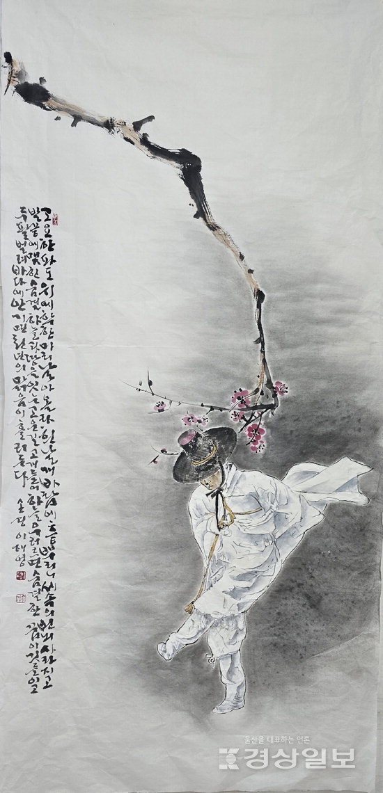 작품‘학무도(鶴舞圖)’를 보면 오래된 매화 가지에 꽃이 피어 있고 그 아래 학무를 추고 있는 선비를 그리고 있다. 꺾여진 매화 가지가 예를 갖춰 마치 학무를 추는 선비의 갓을 피하고 있는 듯하다. 선비의 춤사위와 매화의 꺾임이 일체화되어 움직이고 있다.