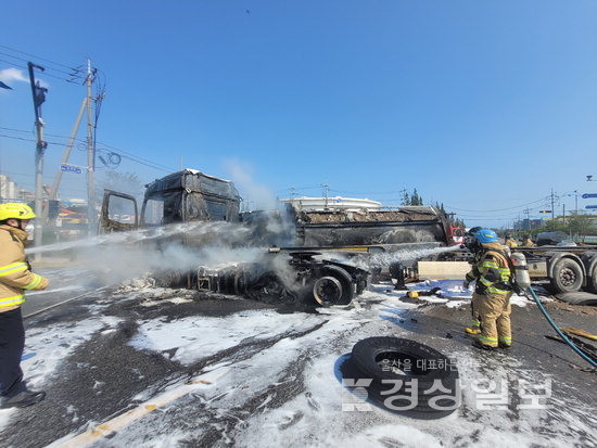11일 오전 11시16분께 남구 황성동 용연사거리에서 덤프트럭과 트레일러가 충돌해 60대 덤프트럭 운전자가 숨지고, 50대 트레일러 운전자가 부상을 입었다. 소방당국에 따르면 사고 직후 화재가 발생하면서 덤프트럭과 트레일러가 모두 불에 탔다. 사고 차량에서 흘러나온 경유가 도로를 덮으면서, 한때 방제 작업이 이뤄졌다.
