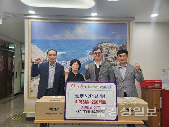 ▲ 울산 동구 CK치과병원은 제29회 노인의 날을 맞아 13일 100만원 상당의 치약·칫솔 세트를 일산동 행정복지센터에 전달했다. 전달된 물품은 오는 15일 일산동행정복지센터에서 열리는 일산동 노인의 날 행사 참석자들에게 배부될 예정이다.울산 동구 CK치과병원은 제29회 노인의 날을 맞아 13일 100만원 상당의 치약·칫솔 세트를 일산동 행정복지센터에 전달했다. 전달된 물품은 오는 15일 일산동행정복지센터에서 열리는 일산동 노인의 날 행사 참석자들에게 배부될 예정이다.