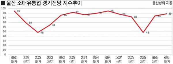 13일 울산상공회의소가 관내 31개 표본 소매유통업체를 대상으로 실시한 ‘2025년 4분기 소매유통업 경기전망지수’(RBSI) 조사에 따르면, 울산 4분기 소매유통업 전망치는 89로 집계됐다. 지난분기(48→84) 반등세를 이어갔지만, 여전히 기준치(100)를 밑돌았다. 이는 지역 내 소비 회복이 여전히 제한적임을 의미한다.
