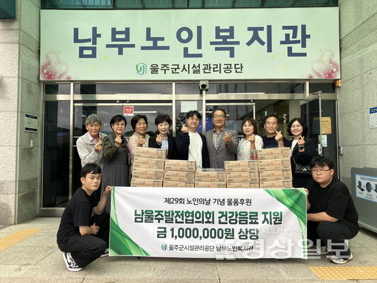 ▲ 울산 울주군시설관리공단 남부노인복지관(관장 조덕행)은 14일 남울주발전협의회(회장 한성율)로부터 100만원 상당의 건강음료 1000개를 기부받았다고 밝혔다.울산 울주군시설관리공단 남부노인복지관(관장 조덕행)은 14일 남울주발전협의회(회장 한성율)로부터 100만원 상당의 건강음료 1000개를 기부받았다고 밝혔다. 저작권자 © 울산일보 무단전재 및 재배포 금지 신동섭 기자 다른기사 보기 페이스북 트위터 카카오스토리 URL복사 기사공유하기