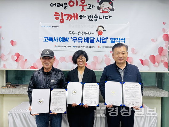 ▲ 울산 중구 중앙동 행정복지센터(동장 김위란)와 중앙동 지역사회보장협의체(위원장 엄진영), 한국야쿠르트 병영점(점장 강선구)은 14일 중앙동 행정복지센터 동장실에서 ‘똑똑! 안녕하세요! 고독사 예방 우유 배달사업’ 운영을 위한 업무협약을 맺었다.울산 중구 중앙동 행정복지센터(동장 김위란)와 중앙동 지역사회보장협의체(위원장 엄진영), 한국야쿠르트 병영점(점장 강선구)은 14일 중앙동 행정복지센터 동장실에서 ‘똑똑! 안녕하세요! 고독사 예방 우유 배달사업’ 운영을 위한 업무협약을 맺었다.