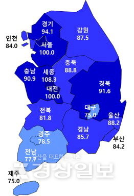 서울(100.0)은 소폭 하락했지만 경기(94.1)와 인천(84.0)이 상승하며 전체 평균을 끌어올렸다. 울산은 하락했지만 여전히 전국 평균을 웃돌며, 광역시 중에서는 대전(100.0)에 이어 2번째로 높은 수준을 기록했다. 부산(84.2), 대구(75.0), 광주(78.5) 등 주요 도시를 모두 앞섰다.