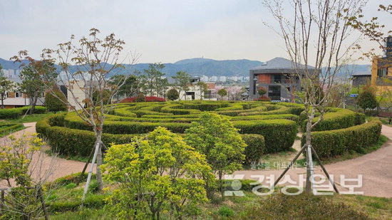 나무울타리 안쪽으로는 완만한 언덕이 넓게 형성돼 있고 나무들이 군데군데 심겨있다. 마치 허리를 굽히고 편안히 들어오라고 손짓하는 것 같다. 진입 계단이 나무로 만들어져 있어 발도 편하고 오르는 소리도 요란하지 않다. 나무 계단을 올라서니 눈길을 사로잡는 미로정원이 바로 눈에 들어왔다. 높이 1미터 정도인 측백나무로 단장된 것을 보고 미로정원임을 알아챘다. 아이들이 잡았던 부모 손을 놓고 재빨리 이곳으로 들어갈 것 같다.