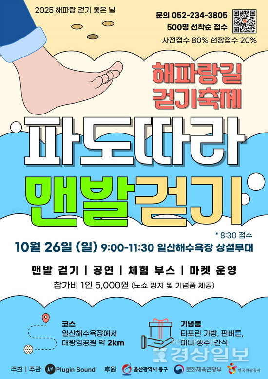 ‘파도 따라 맨발 걷기’는 해파랑길 8코스 구간 중 일산해수욕장에서 대왕암공원까지 약 2㎞ 구간을 따라 맨발로 걷는 체험형 행사로 파도 소리와 모래의 촉감을 직접 느끼며 자연과 교감할 수 있도록 기획됐다.