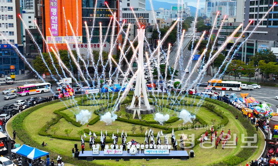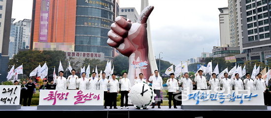 ○…공업탑로터리에서 열린 출정식에서 김두겸 울산시장, 이성룡 울산시의회 의장, 김철 울산공업축제추진위원장 등이 울산과 시민, 기업과 노동자의 상생발전을 위한 구호 제막식을 가지자 화려한 불꽃이 터지며 축제의 시작을 알렸다. 김 시장이 ‘최강! 울산 선언문’을 낭독한 뒤 ‘엄지 척’ 모습의 조형물이 모습을 드러내며 최강 울산의 이미지를 공고히 했다.