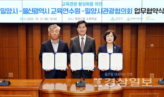울산교육연수원은 경남 밀양시, 밀양시관광협의회와 21일 밀양시청 소회의실에서 지역 자원을 활용한 현장 체험 연수 지원 등을 내용으로 하는 업무협약을 체결했다. 협약은 밀양시가 보유한 교육 관광 자원을 적극 활용해 교직원의 연수 참여 기회를 확대하고 교직원의 역량을 높이고자 추진됐다.