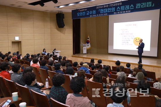 ▲ 울산 동구는 22일 5층 중강당에서 오한진 교수의 ‘스트레스 관리법’을 주제로 강연을 개최했다. 오 교수는 현대인들이 겪는 스트레스의 원인과 해소 방법, 마음건강 관리의 중요성을 쉽고 유쾌하게 설명했다.울산 동구는 22일 5층 중강당에서 오한진 교수의 ‘스트레스 관리법’을 주제로 강연을 개최했다. 오 교수는 현대인들이 겪는 스트레스의 원인과 해소 방법, 마음건강 관리의 중요성을 쉽고 유쾌하게 설명했다.