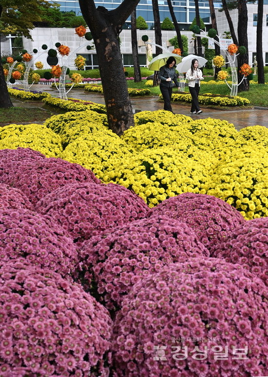 가을비가 내린 22일 가을국화전시회를 앞두고 있는 울산 북구청 광장을 찾은 시민들이 우산을 받쳐들고 국화꽃이 만개한 정원을 걷고 있다. 가을국화전시회는 오는 27일 개막해 11월 말까지 이어진다. 김동수기자 dskim@ksilbo.co.kr