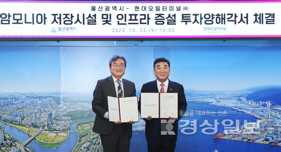 울산시는 22일 시청 본관 7층 시장실에서 김두겸 울산시장과 신동화 현대오일터미널 대표이사가 참석한 가운데 ‘암모니아 저장시설 및 기반 증설 투자’ 양해각서(MOU)를 체결했다고 밝혔다.