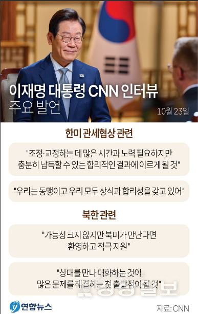 서울 용산 대통령실에 따르면 이 대통령은 CNN방송과 진행한 인터뷰에서 “이번 APEC 정상회의를 계기로 혹여라도 북미가 전격적으로 만날 수 있다면 전적으로 환영하고 적극적으로 지원할 생각”이라고 밝혔다.