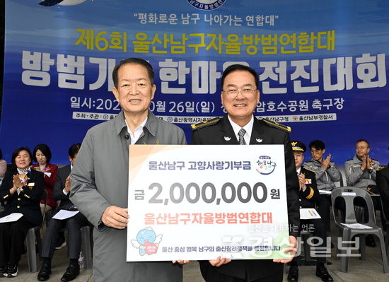 ▲ 울산남구자율방범연합대는 26일 선암호수공원 축구장에서 남구 16개 자율방범대 대원과 내빈 400여명이 참석한 가운데 ‘제6회 방범가족 한마음 전진대회’를 개최했다. 이날 연합대는 지역 발전과 상생의 뜻을 담아 고향사랑기부금 200만원을 남구에 기탁했다.울산남구자율방범연합대는 26일 선암호수공원 축구장에서 남구 16개 자율방범대 대원과 내빈 400여명이 참석한 가운데 ‘제6회 방범가족 한마음 전진대회’를 개최했다. 이날 연합대는 지역 발전과 상생의 뜻을 담아 고향사랑기부금 200만원을 남구에 기탁했다.