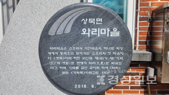 1872년 옛 지도에는 가지산, 가슬현, 고헌산 아래 와항현(瓦項峴)이 있다고 분명히 밝혀두었고, 고헌산 아래 소호로 들어가는 길목 ‘와리(瓦里)’란 마을의‘와리(瓦里)’유래를 새긴 돌에선 재(嶺)가 재(‘기와(瓦)’의 옛말)로 변해서 와리(瓦里)로 바뀌었고, 기와를 굽던 곳이라 하여 ‘와리’ 또는 ‘기와목(瓦項)’이라고도 한다는 설명이 붙었다. 이를 입증하듯 거기서 만난 이순금(87), 류경연(83) 두 어른의 입 밖으론 단 한 번도 ‘외항재’란 말이 나오지 않았다. 이곳에서 구운 기와를 지고 저 고개를 넘었다는 그들 말씀에 더는 ‘외항재’를 쓸 필요가 없어졌다.