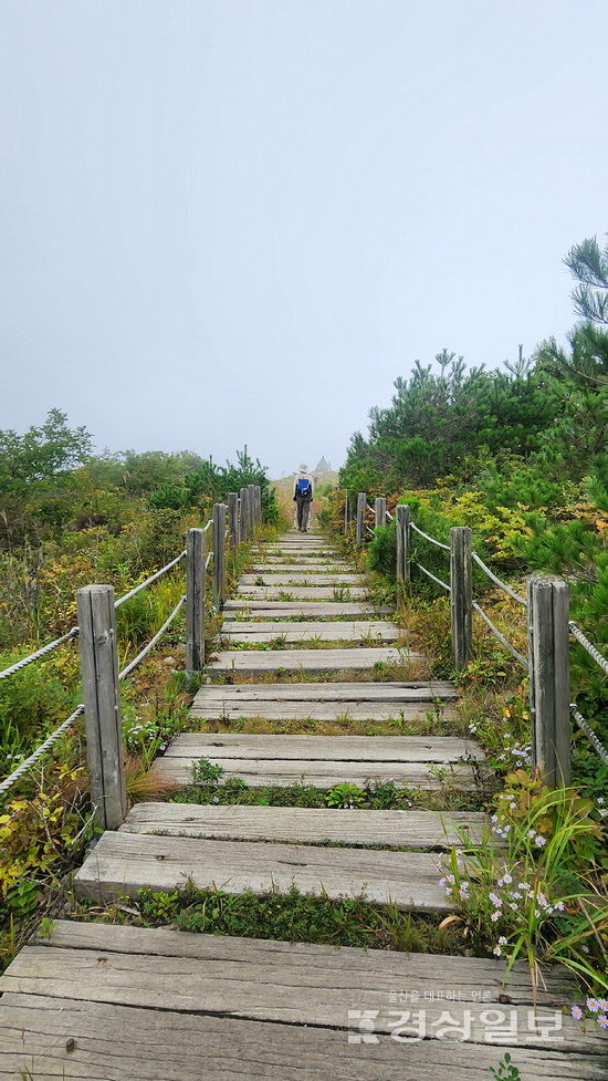 가을의 전령사는 뭐니 뭐니해도 발목을 잡아끄는 여뀌, 고마리, 마타리가 아닌가 싶고 닮아서 친구가 된 쑥부쟁이와 구절초는 자태랄 것도 없는데 서로의 외양을 뽐낸다. 비를 머금은 구름은 낮게 가라앉았다. 600개가 넘는 계단을 밟고 허위 허위 오른 산객을 반갑게 맞이하는 것은 노란색 미역취다. 이때 참으로 고개를 갸웃거리게 하는 것은 안내판의 지명이다. 처음엔 분명 ‘와항재’로 했을 푯말의 모음 ‘ㅏ’에서 점 하나를 뗀 ‘ㅣ’ 인 ‘외항재’로 일부러 지운 흔적을 보았기 때문이다. 고헌산을 찾는 등산객도 ‘와항재’가 잘못됐고 ‘외항재’가 옳다는 생각에 큰 신경을 쓰지 않는 눈치다.