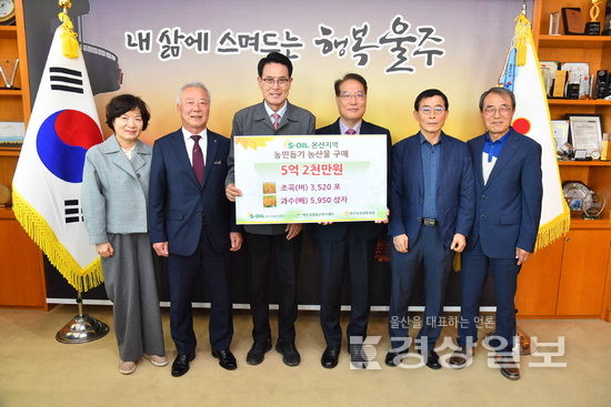 올해 매입 물량은 일반조곡 3520포, 배 5950상자 등 총 5억원 상당의 농산물이다. S-OIL 울산복지재단이 올해까지 매입해 기부한 물량은 92억원 상당의 조곡 5430t, 26억원 상당의 배 784t에 달한다.