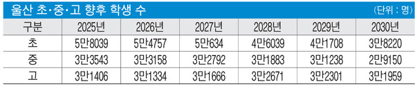 27일 시교육청에 따르면, 2025년 울산 초등학생 수는 5만8039명이다. 이 숫자는 해마다 감소해 2028년에는 4만6039명으로 4만명대로 진입한 뒤 2030년에는 3만8220명으로 올해 대비 약 34.2% 줄어들 전망이다.