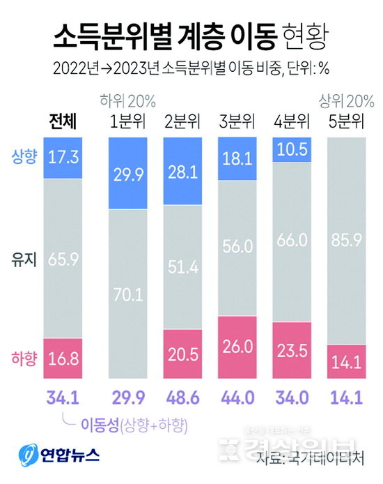 울산의 상향이동 비율은 17.1%, 하향이동 비율은 14.8%로, 상향이 하향보다 2.3%p 많았다. 하향이동 비율이 전국에서 두 번째로 낮아 겉으로는 소득 안정성이 높아 보이지만, 상향이동 역시 전국 평균(17.3%)에 미치지 못하면서 움직이지 않는 사회로의 경직 현상이 심화되고 있다.