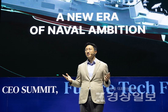 정기선 HD현대 회장이 27일 경주엑스포대공원 문화센터 문무홀에서 열린 아시아 태평양 경제협력체(APEC) 최고경영자(CEO) 서밋 ‘퓨처 테크 포럼: 조선’에서 기조연설하고, HD현대가 중심이 되는 한미 간 조선 발전 방항을 제시했다.
