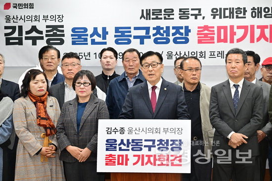 울산시의회 김수종 부의장은 29일 시의회 프레스센터에서 기자회견을 열고 “위기에 처한 동구를 다시 일으켜 세우기 위해서는 리더십을 갖춘 전문가가 그 어느 때보다 절실하다”며 제9회 전국동시지방선거에서 국민의힘 후보로 울산 동구청장에 도전할 것을 공식적으로 선언했다.