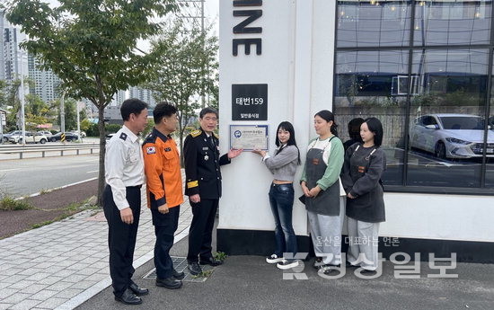 울산 북부소방서는 30일 북구 매곡동에 위치한 ‘태번159’를 올해 ‘안전관리 우수 다중이용업소’로 신규 선정해 현판식을 개최했다. 태번159는 평소 소방시설 유지관리와 피난시설 확보 등 자율적인 안전관리 실천에 앞장선 공로를 인정받아 소방의 날 기념 행사때 소방서장 표창이 함께 수여될 예정이다.