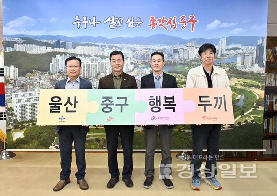 울산 중구와 SK가스(대표 윤병석), 행복나래(주)(대표 박재한), 행복도시락 사회적협동조합(이사장 박찬무)은 30일 중구청 구청장실에서 ‘행복두끼 프로젝트’ 추진을 위한 업무협약을 맺었다. 중구와 SK가스, 행복나래, 행복도시락 사회적협동조합은 1년 동안 결식 우려 아동 40여명에게 1만400개의 행복도시락을 지원할 예정이다.