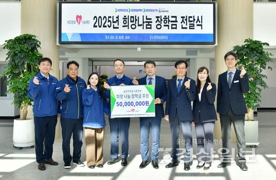 장학금 전달식은 이날 동구 현대청운중학교에서 한성기 강북교육지원청 교육장과 HD현대중공업 임직원, 이상규 현대청운중학교 교장 등이 참석한 가운데 열렸다.