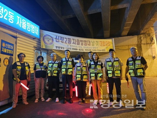신정2동 자율방범대는 신정2동의 슬로건인 ‘Happy Happy 신정2동’을 위해 주 3회 이상 야간 봉사를 하고 있다. 옥동지구대 경찰들과 협력해 야간 우범지역을 순찰하며 범죄 예방에 앞장서고 있다.