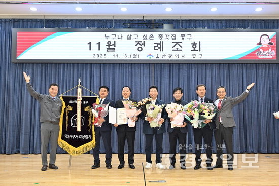 ▲ 김영길 울산 중구청장이 3일 중구청 대회의실에서 열린 11월 정례조회에서 학성가구거리 상인회에 전통시장 및 상점가 활성화 대통령 표창, 김성열 구역전시장 상인회장과 반구시장 상인회, 학성새벽시장 상인회에 전통시장 및 상점가 활성화 중기부 장관 표창을 전수했다.김영길 울산 중구청장이 3일 중구청 대회의실에서 열린 11월 정례조회에서 학성가구거리 상인회에 전통시장 및 상점가 활성화 대통령 표창, 김성열 구역전시장 상인회장과 반구시장 상인회, 학성새벽시장 상인회에 전통시장 및 상점가 활성화 중기부 장관 표창을 전수했다.