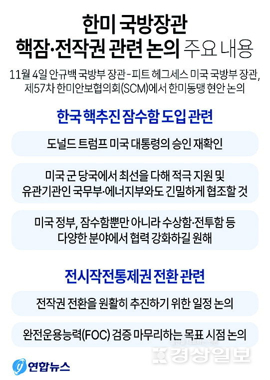 한편, 이날 한미 국방부 장관은 용산 국방부 청사에서 열린 제57차 한미안보협의회(SCM)에서 한국의 핵추진 잠수함 도입과 전시작전통제권 전환 등 한미동맹 현안을 논의했다.