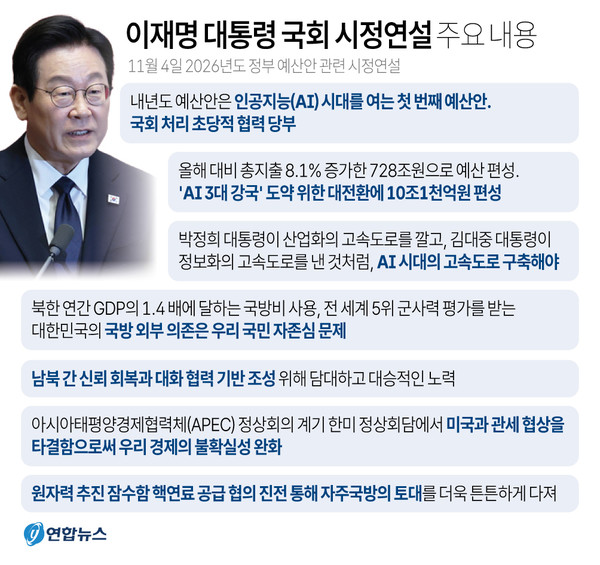 이재명 대통령의 4일 내년도 예산안과 관련한 국회 시정연설 주요 의제는 △AI 기술이 방위산업의 판도 변화에 대응하는 국방비 증액 △한반도 평화 프로세스 관련 대응 △국가 균형발전을 위한 5극3특(5개 초광역권과 3개 특별자치도) 추진 △취약계층 지원책에 등에 비중을 둔 것으로 분석됐다.