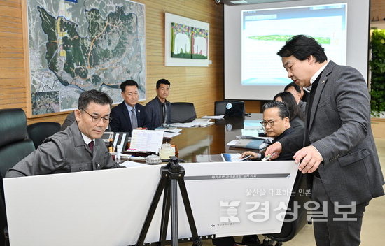 ▲ 울산 중구는 5일 중구청 구청장실에서 태화강변 파크골프장 설치사업 실시설계용역 중간 보고회를 개최했다. 이날 김영길 중구청장과 관계 공무원, 용역사 관계자는 파크골프장 코스 구성 등을 살펴보고 다양한 의견을 나눴다. 울산 중구청 제공울산 중구는 5일 중구청 구청장실에서 태화강변 파크골프장 설치사업 실시설계용역 중간 보고회를 개최했다. 이날 김영길 중구청장과 관계 공무원, 용역사 관계자는 파크골프장 코스 구성 등을 살펴보고 다양한 의견을 나눴다. 울산 중구청 제공