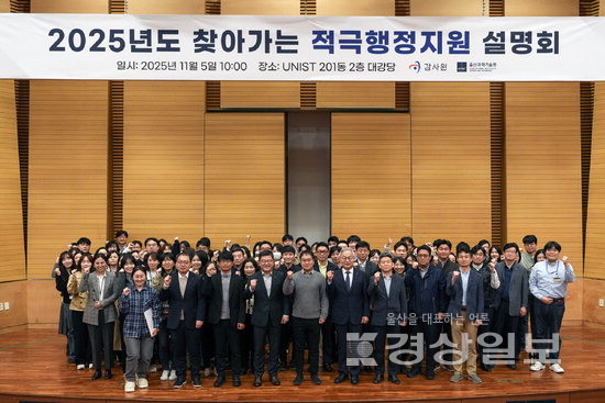 ▲ UNIST 감사실은 지난 5일 교직원과 감사원 및 근로복지공단, 한국동서발전, 한국산업안전보건공단, 한국석유공사, 한국에너지공단 등 지역 공공기관 임직원 130여명이 참석한 가운데 ‘2025년도 찾아가는 적극행정지원 설명회’를 열었다고 6일 밝혔다.UNIST 감사실은 지난 5일 교직원과 감사원 및 근로복지공단, 한국동서발전, 한국산업안전보건공단, 한국석유공사, 한국에너지공단 등 지역 공공기관 임직원 130여명이 참석한 가운데 ‘2025년도 찾아가는 적극행정지원 설명회’를 열었다고 6일 밝혔다.