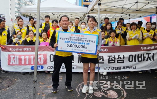 울산 아너 소사이어티 클럽 회원인 한국공인중개사협회 울산시회 에코사랑공인중개사사무소 박해정 대표가 지난 9일 대현동행정복지센터 주차장에서 울산보금자리NGO에서 진행한 짜장면 무료급식 지원비 500만원을 울산 사회복지공동모금회에 전달했다고 10일 밝혔다. 전달식은 무료급식 봉사활동이 이뤄지는 대현동행정복지센터에서 진행됐다. 박해정 에코사랑공인중개사사무소 대표, 이섬규 사단법인 울산보금자리NGO 회장 등이 참석했다. 박해정 대표는 지난 2021년 총 1억원을 기부하기로 약정하고 울산 아너 소사이어티 105호 회원으로 가입했다. 김은정기자 저작권자 © 울산일보 무단전재 및 재배포 금지 김은정 기자 다른기사 보기 페이스북 트위터 카카오스토리 URL복사 기사공유하기