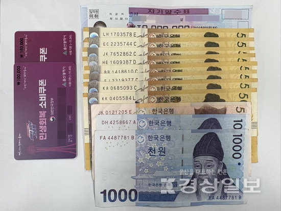 그가 내놓은 것은 사용하지 않은 28만원 상당 민생회복 소비쿠폰 카드 2장과 1000만원권 수표 1장, 현금 40만7000원 등의 성금이었다.