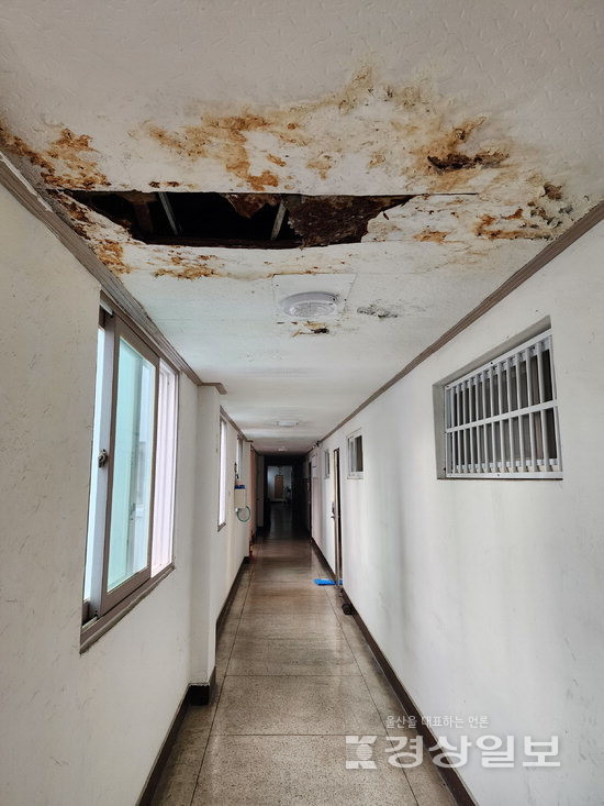 준공 반세기가 가까워지면서 시설 노후는 누적돼 왔다. 옥상 방수층이 제 기능을 하지 못해 빗물이 건물 틈으로 스며들기 시작했고, 시간이 흐르며 외벽 균열과 누수 흔적은 더 뚜렷해졌다. 다른 복도 구간에서도 천장 마감재가 갈라지거나 떨어져 나간 흔적을 쉽게 발견할 수 있었다.