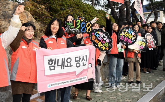 울산청소년상담복지센터는 중앙고 정문에서 핫팩을 나눠주며 학생 한 명 한 명에게 진심 어린 응원을 보냈다. 학생들이 교문으로 들어설 때마다 “시험 잘 쳐요” “화이팅!”을 연호하며 수험생들의 긴장감을 덜어줬다. 학생들은 응원에 쑥쓰러운 듯 고개 숙여 감사의 인사를 전한 뒤 시험장으로 향했다. 센터 관계자는 “센터 직원 모두가 총출동했다”며 “일생일대의 시험이니만큼 학생들이 긴장하지말고 제 실력을 발휘하고 오길 기원한다”고 말했다. 사회문화부 종합
