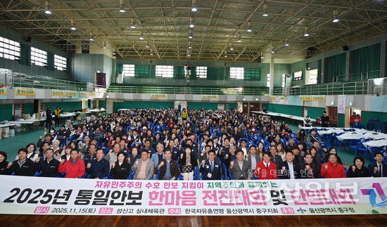 ▲ 한국자유총연맹 울산중구지회(회장 장해식)는 지난 15일 성신고등학교 실내체육관에서 김영길 중구청장과 박경흠 중구의회 의장, 박성민 국회의원, 이성룡 시의회 의장, 시·구의원, 자유총연맹 회원 등이 참석한 가운데 2025 통일안보 한마음 전진대회를 개최했다.한국자유총연맹 울산중구지회(회장 장해식)는 지난 15일 성신고등학교 실내체육관에서 김영길 중구청장과 박경흠 중구의회 의장, 박성민 국회의원, 이성룡 시의회 의장, 시·구의원, 자유총연맹 회원 등이 참석한 가운데 2025 통일안보 한마음 전진대회를 개최했다.