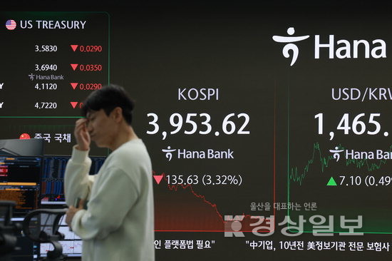 이날 코스피는 전장보다 135.63p(3.32%) 내린 3953.62로 장을 마쳤다. 코스피가 종가 기준으로 4000선 아래로 내려온 건 이달 7일 이후 7거래일만이다.