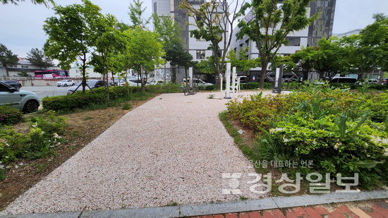 파고라가 있는 주변으로 얼마 전에 꽃무릇을 식재해 놓은 것 같다. 어느 정도 시기를 거치면 곧 파릇해질 것이라는 그림이 그려진다. 왼편에는 운동기구가 놓여 있다. 바닥에는 흰 파쇄석이 깔려있고 벌집 모양의 플라스틱판으로 고정을 해놓았다. 흰색 운동기구에 흰색 파쇄석이 공원의 이미지를 아주 깨끗하고 밝게 각인시켜 준다. 운동기구를 사용하다 가끔씩 신발을 벗고 지압을 즐겨도 좋을 것 같다.