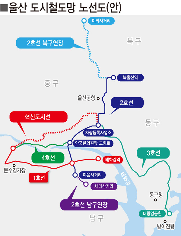 울산시가 도시 확장과 인구 변화에 맞춰 도시철도망을 전면 손질하고 혁신도시를 관통하는 신규 노선을 더해 ‘도심 순환철도망’ 구축에 나선다.