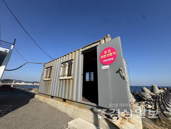 현재 컨테이너는 바닷가 가장자리에 걸쳐져 있고 아래에는 돌받침이 놓여 지탱하고 있는 구조로 아직도 자리를 지키고 있다. 어촌계 사무실 뒤편 통로에는 테이블도 설치돼 있는데 테이블 위에는 ‘무인라면 전용’이라는 안내 문구와 ‘외부 음식 반입 금지’표지가 붙어 있다.