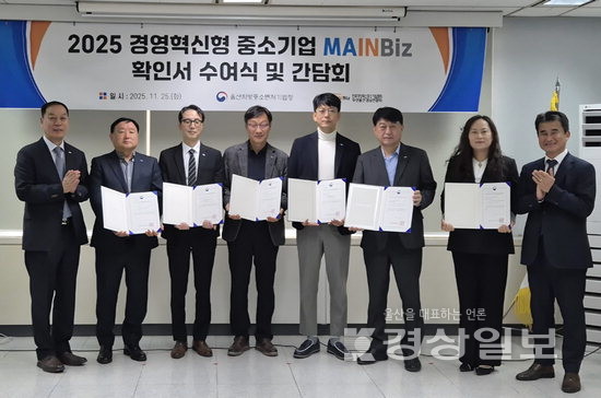 울산지방중소벤처기업청(청장 노형석)과 한국경영혁신중소기업협회 부산·울산·경남 연합회(회장 김종호)는 25일 울산중기청 청사 중회의실에서 경영혁신형 중소기업(메인비즈 기업) 확인서 수여식을 개최했다고 밝혔다.